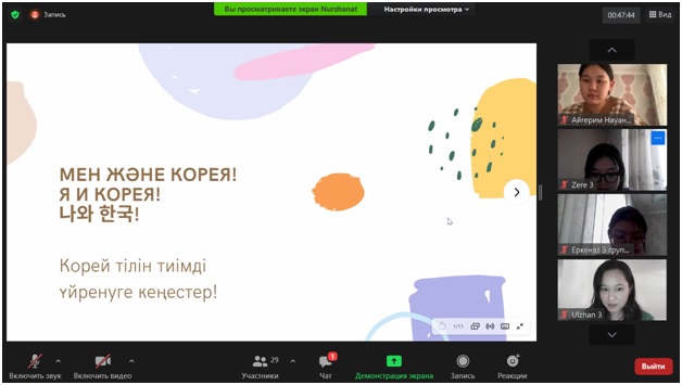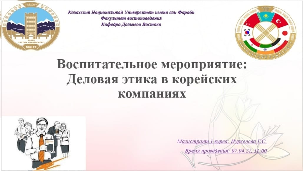 2021 жылдың 6 сәуірінде сағат 12-00-де ZOOM платформасы арқылы шығыстану факультетінің 1 курс магистранты Юсупова М.М. аға оқытушылар Ташкенбаева Б. Ж. және Серикбаева З. А. жетекшілігімен факультеттің 2 және 3 курс студенттері үшін "Жұмысқа сәтті орналасу" тақырыбында кәсіби еңбектік тәрбиелік мақсаттағы іс-шара өткізді.