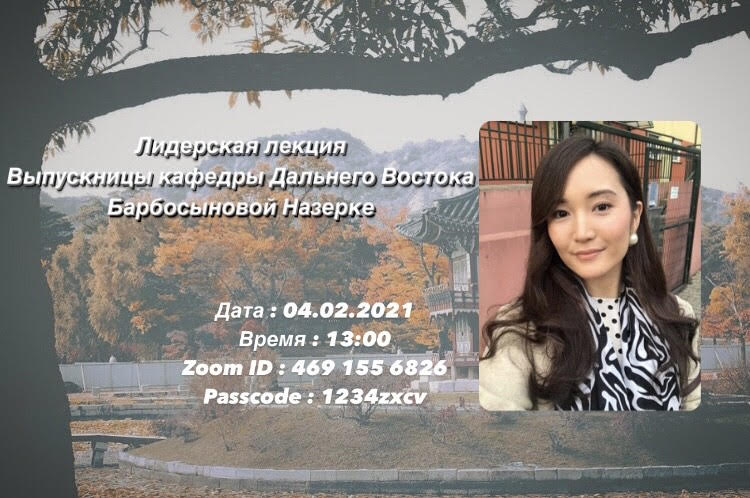 08.02.20212021 жылдың 4 ақпанында сағат 13:00-де ZOOM онлайн-платформасында 1 курс кеңесшісі Ким Э.В жетекшілігімен «COVID-19 пандемиясы кезіндегі корей тілінің аудармашысының қызметі» тақырыбында көшбасшылық дәрісі өткізілді. Әл-Фараби атындағы ҚазҰУ-нің 2018 жылғы түлегі Барбосынова Назеркемен Қиыр Шығыс кафедрасының корейтану бөлімінің 1-4 курс студенттерінің қатысуымен кездесу өтті. Барбосынова Назерке 2016 жылы Аударма ісі бойынша бакалавр дәрежесін алып, 2018 жылы сол мамандық бойынша магистр дәрежесін алып, диссертациясын сәтті қорғады. Оның аударма, зерттеу және шетелде жұмыс жасауда мол тәжірибесі бар. Ол екі рет Оңтүстік Кореяда Сеул қаласында сынақтан өтті, сонымен бірге 10 ай бойы Польшада халықаралық корей компаниясында жұмыс істеді. Назерке өз тәжірибесімен бөлісті және корей тілін үйрену бойынша кеңестер берді, аудармашы қызметі туралы, бұл мамандыққа тек Қазақстанда ғана емес, сонымен қатар шетелде де сұранысы бар екендігін айтты. Жұмыс іздеу, бос уақытын қалай өткізетінін, сондай-ақ өзінің болашақ жоспарларымен бөлісті.