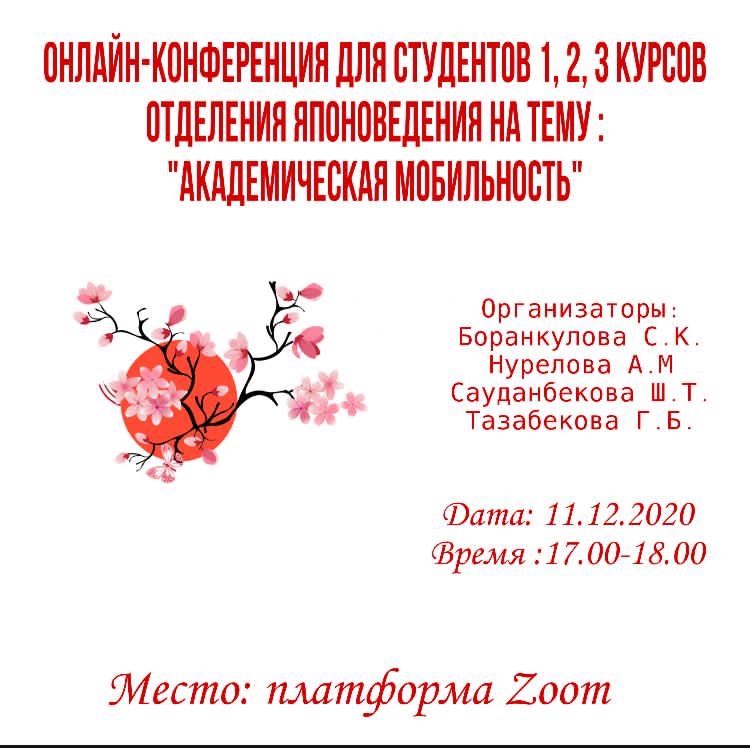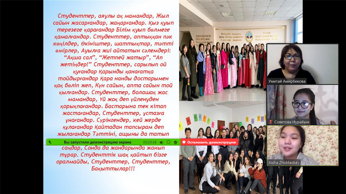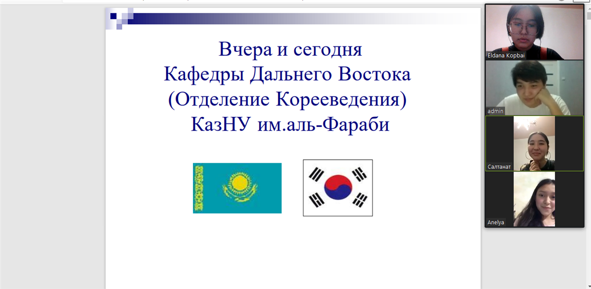 11.12.20202020 жылдың 11 желтоқсанында әл-Фараби атындағы Қазақ ұлттық университеті шығыстану факультеті Қиыр Шығыс кафедрасының эдвайзерлері У.А.Амирбекова мен Б.Ж.Ташкенбаеваның жетекшілігімен корейтану бөлімінің 2-3 курс студенттері үшін Тәуелсіздік мерекесіне орай «16 желтоқсан – Қазақстанның Тәуелсіздік күні» тақырыбында онлайн форматтағы кураторлық сағат өткізілді.