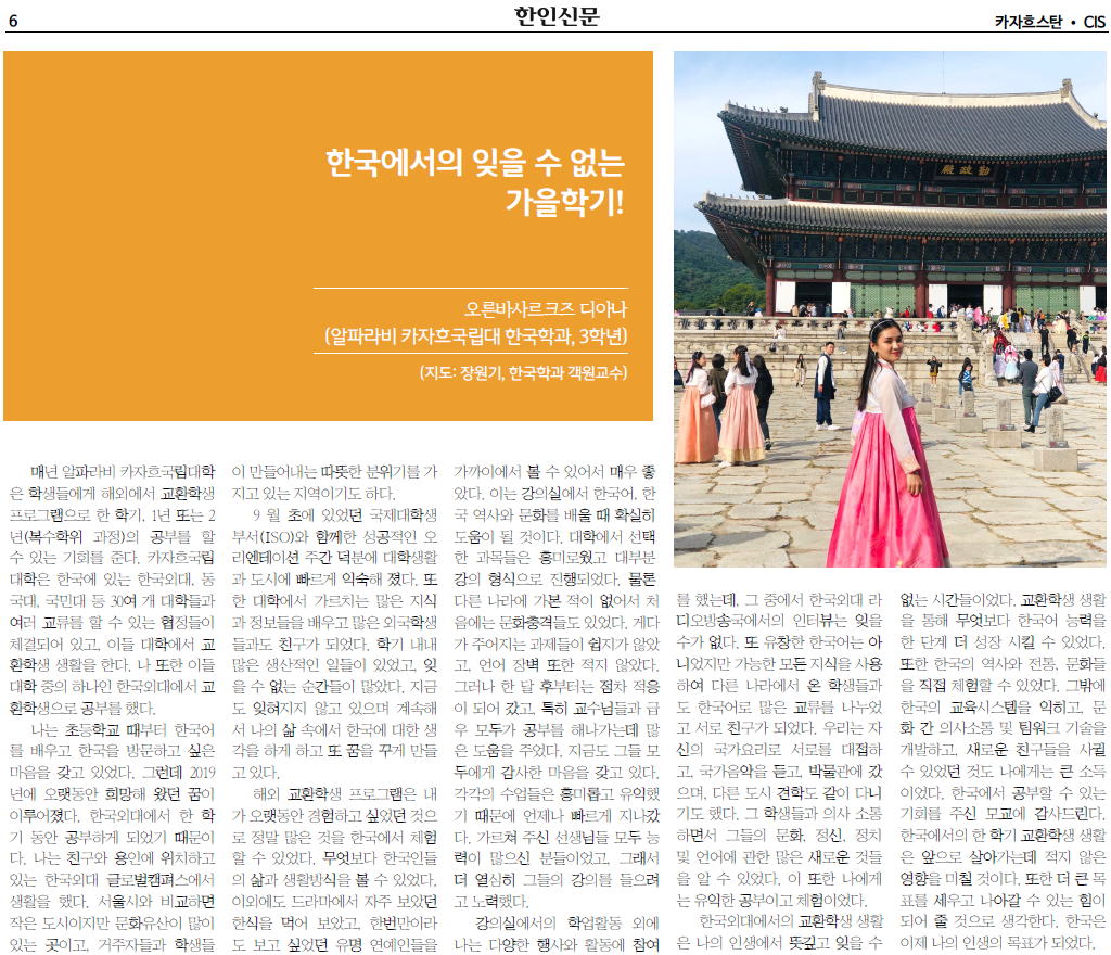 27.11.2020Кореядан келген Қиыр Шығыс кафедрасының профессоры Джанг Вонки аккадем мобильностьпен кореяға кеткен студенттердің өмірі туралы жазды (Орынбасаркызы Диана туралы)