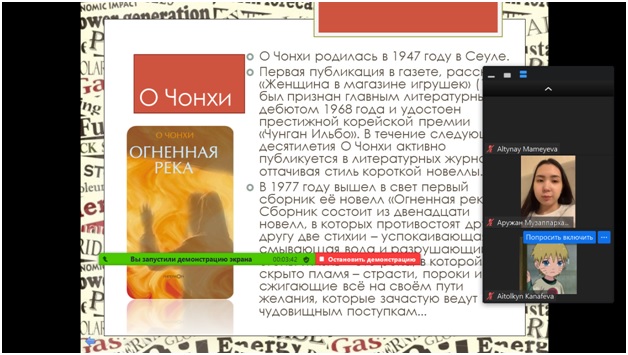 04.12.20202020 жылдың 4 желтоқсанында «100 кітап» жобасы аясында студенттердің «Шин сэдэ» ғылыми үйірмесінің ұйымдастыруымен «Қазіргі заманғы корей прозасы» тақырыбында танымдық іс-шара өткізілді.