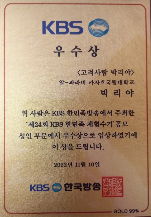 KBS корей радиостанциясы корейтану бөлімінің студенті Пак Лияны "Ересектер арасындағы Үздік эссе" номинациясымен марапаттады
