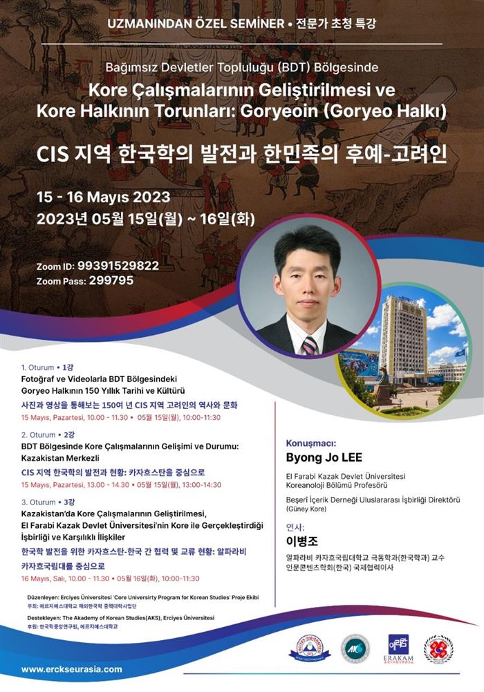 2023 жылғы 15-16 мамыр аралығында Әл-Фараби атындағы Қазақ ұлттық университетінің Қиыр Шығыс кафедрасының профессоры Ли Бенг Джо Түркиядағы Эрджиес университетінің корейтану кафедрасының студенттеріне арнайы онлайн дәріс өткізді. Барлығы 3 арнайы дәріс өткізілді. Бірінші күні "ТМД Коре сарамының тарихы мен мәдениетіне (дәстүріне) 150 жыл" және "ТМД аймағындағы корейтанудың дамуы мен қазіргі жағдайы: Қазақстанды негізгі ала отырып" тақырыптарында арнайы дәрістер оқылды. Екінші күні "Корейтануды дамыту үшін Қазақстан мен Корея арасындағы ынтымақтастық пен алмасудың қазіргі жағдайы: Әл-Фараби атындағы Қазақ ұлттық университетінің назарында" тақырыбында өтті. Арнайы дәріске барлығы 100 бакалавриат, магистратура және докторантура студенттері, сондай-ақ корейтану оқытушылары қатысты. Атап айтқанда, соңғы арнайы дәрісте профессор Ли Бенг Джо Әл-Фараби атындағы ҚазҰУ-да корейтану саласының білім беру жүйесі туралы толық сипаттамасын ұсынды, осы арқылы Эрджиес университетінің корейтану кафедрасының студенттері мен оқытушылары Әл-Фараби атындағы Қазақ Ұлттық университетінің Қазақстанда және ТМД аймағында корейтану саласындағы жетекші рөліне қатты таң қалды.