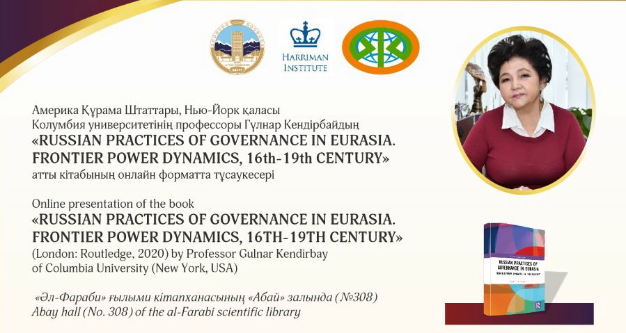 2021 жыл 14 сәуір сағат 15.00-де әл-Фараби атындағы ҚазҰУ, «Әл-Фараби» Ғылыми кітапханасының №308 «Абай» залында Америка Құрама Штаттары, НьюЙорк қ. Колумбия университетінің профессоры Гүлнар Кендірбайдың «Russian Practices of Governance in Eurasia. Frontier Power Dynamics, 16th-19th Century» атты кітабының тұсаукесері өтеді (London: Routledge, 2020).
