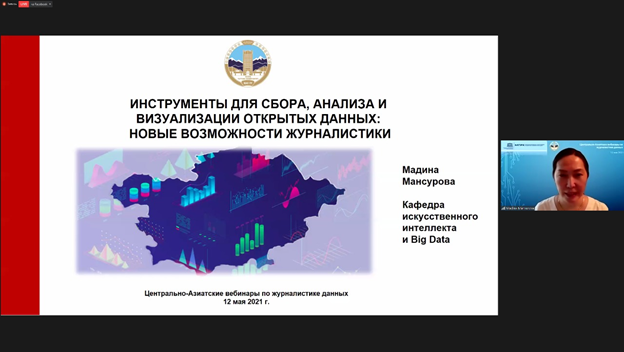 2021 жылғы 5 мамырдан бастап деректер журналистикасы саласындағы білім беру сапасына бағытталған Орталық Азияда вебинарлар сериясы басталды. Жобаға тартылған 19 жоғары оқу орны ЮНЕСКО-ның оқу бағдарламасын 2021 жылғы 5, 12, 19 және 26 мамырда өтетін вебинарларда кіріктіретін болады, оны ҚРҮПРМ журналистік білім беру саласындағы озық тәжірибе жөніндегі жаһандық бастамасының және Алматыдағы ЮНЕСКО Бюросының қолдауымен әл-Фараби атындағы Қазақ ұлттық университетінің журналистика және коммуникациялар жөніндегі ЮНЕСКО кафедрасы ұйымдастырады. Орталық Азиядағы 55 журналистика университетіне ЮНЕСКО-ның журналистік білім беру бойынша оқу бағдарламалары қажет, оның ішінде Қазақстандағы 30 университет, Қырғызстандағы 10 Университет, Тәжікстандағы 8 университет және Өзбекстандағы 7 университет бар. Орталық Азия журналистикасының жұмысында деректер журналистикасы интерактивті Графиктер мен көрнекі контенттерді пайдалану үшін тиімді құралға айналды.12 мамырда "деректерді өңдеу және визуалдау құралдары" секциясы бойынша деректер журналистикасы бойынша Орталық Азия вебинарына профессор Томас Ханицшпен (LMU Мюнхен университетінің коммуникация кафедрасының меңгерушісі, Германия), Е.Градовпен (Work Smart білім беру бағдарламасының жетекшісі, Орталық және Шығыс Еуропа, Microsoft, Ресей) қатар доцент, меңгеруші шақырылды.ҚазҰУ-дың жасанды интеллект және Big data кафедрасы.Әл-Фараби Мансұрова Мәдина Есімханқызы.Мәдина Есімханқызы Data Journalism-те тиімді қолдану үшін деректерді өңдеу құралдарының маңызды аспектілерін таныстырды. Баяндама тақырыбы: Ашық деректерді жинау, талдау және визуалдауға арналған құралдар: журналистиканың жаңа мүмкіндіктері.