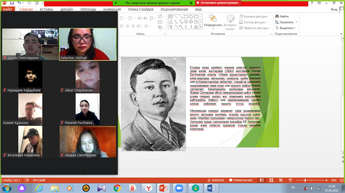 ЖИ және Big Data кафедрасының эдвайзері Акжигит Каламкас Автоматтандыру және басқару мамандығының 3 курс студенттерімен «100 кітап» жобасы аясында Саттар Ерубаевтың «Менің құрдастарым» атты романына арналған кураторлық сағат өтті. Кураторлық сағатта, әдебиет әлемінде жарық жұлдыздай жалт етіп ағып өткен қыршын жас, зор талант иесі Саттар Ерубаев өмірге сүйген жардай ғашық болғандардың бірі және талантты жас қазақ әдебиетінде дарын даралығымен, өзіндік стиль ерекшелігімен көріне білгені жайлы, жалын жастық, баянды бақыт пен мөлдір махабатты тамылжыта жырлаған Саттар Ерубаев 23 жыл ғана ғұмыр кешіп, аз жасап, көп іс тындырып үлгерген халқымыздың аяулы перзенттерінің бірі, жаңа тұрпаттағы тамаша мәдениетті жазушы болғаны жайлы студенттерге айтылды.