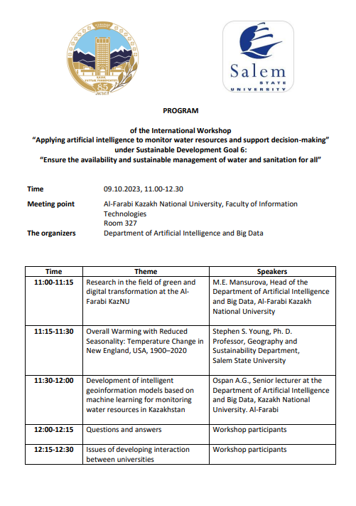 Ұстаздар мен студенттерді Тұрақты дамудың 6-мақсаты: «Баршаға арналған су ресурстарының қолжетімділігі мен ұтымды пайдаланылуын және тиімді пайдаланылуын қамтамасыз ету» аясындағы «Су ресурстарын бақылау және шешім қабылдауды қолдау үшін жасанды интеллектті қолдану» халықаралық семинарына шақырамыз.