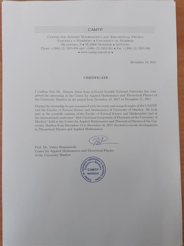 Математика мамандығының 2 курс магистранты Асқар Даурен 12.12.2017-21.12.2017ж аралығында Словения мемлекеті, Марибор қаласындағы, Марибор Университетінен ғылыми тәжірибе алмасудан өтіп келді.