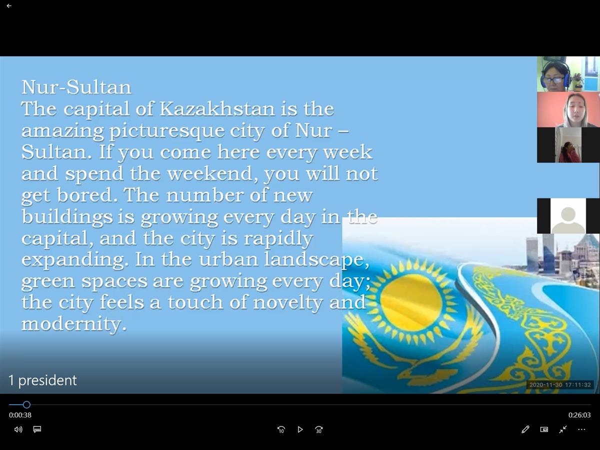 2020 жылдың 30 қарашасында сағат 17.00-де шетел тілдері кафедрасының аға оқытушысы Тілеуғабылова Зейнегүл Анапияқызы «Менеджмент» және «Экономика» мамандықтарының 1 курс студенттерімен бірлесіп, Қазақстан Республикасының 1 Президентіне арналған «Қазақстанның астанасы, Нұр-Сұлтан!» онлайн-іс-шарасын өткізді.