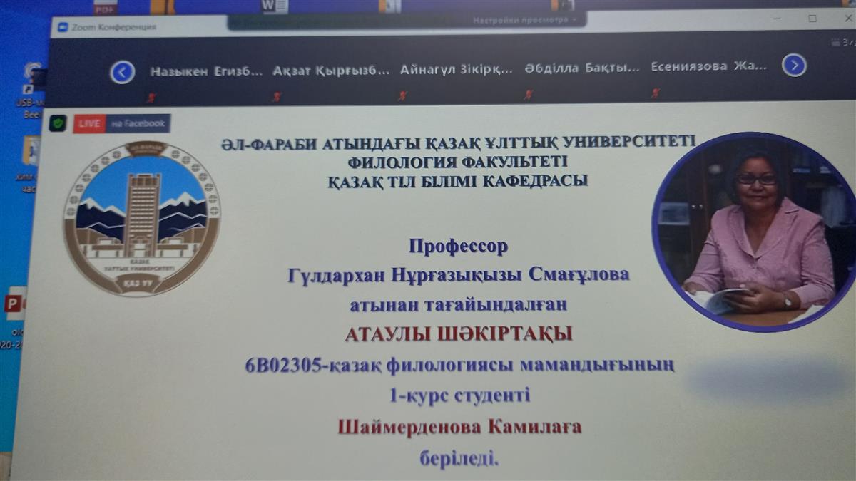 30 қараша, 2020, ZOOM платформасында әл-Фараби атындағы Қазақ ұлттық университетінің қазақ тіл білімі кафедрасының профессоры, филология ғылымдарының докторы Г.Н. Смағұлова «Қазақ дискурсының лингвосинергетикасы» тақырыбында дәріс оқыды.