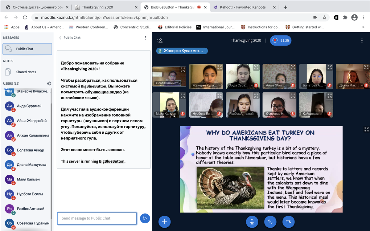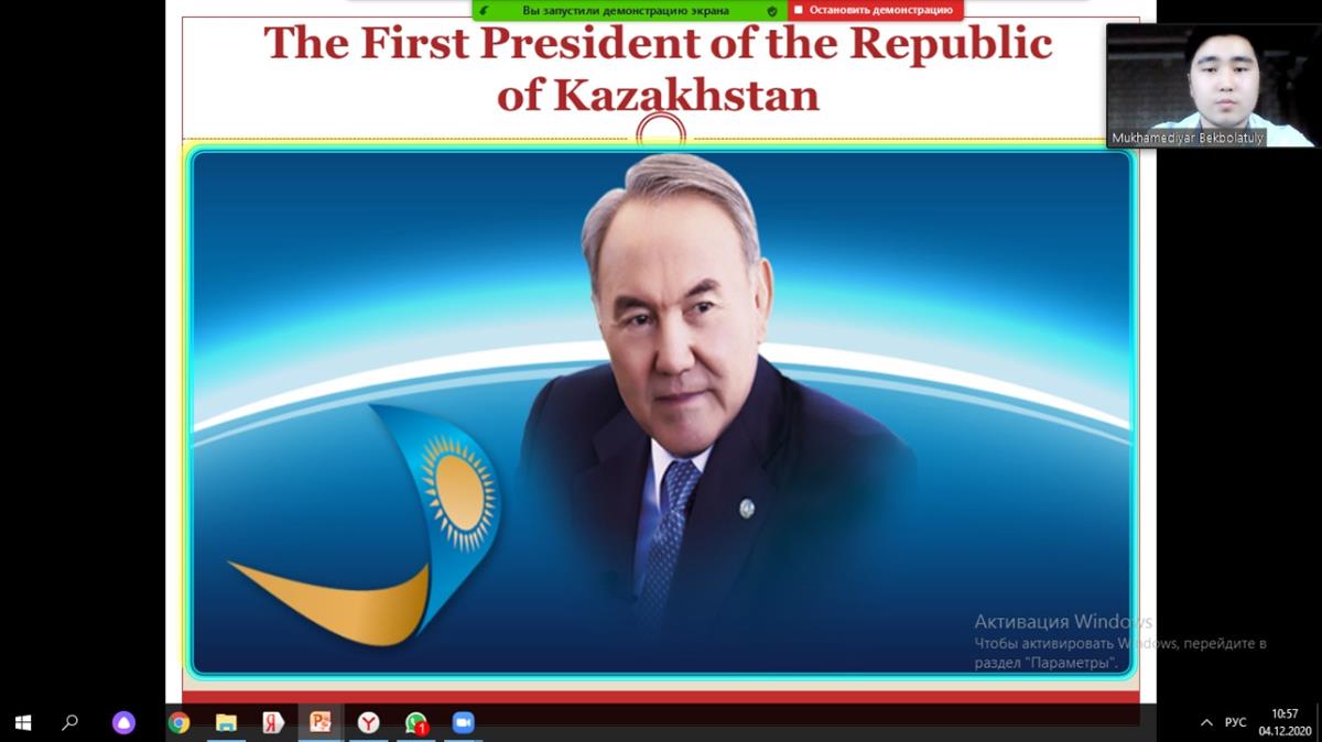Шетел тілдері кафедрасының аға оқытушылары Алиярова Л.М., Махажанова Л.М., Халенова А.Р. «Экономика және бизнес жоғары мектебі» факультетінің 1 курс «Есеп және аудит» мамандығының студенттерімен 01.12.2020 жылы «Қазақстан Республикасының Тұңғыш Президенті, ұлт көшбасшысы Н.Ә.Назарбаевтың тарихи рөлі» тақырыбына on-line іс-шарасын өткізді.
