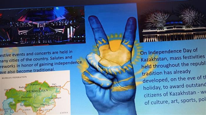 Іс-шара химия және химиялық технология факультетінің бірінші курс студенті Айгерим Джалялетдинованың ашылу сөзімен басталды. Әйгерім Джалялетдинова өз сөзінде бұл мерекенің Қазақстан Республикасы үшін маңыздылығына тоқталды. Қойылым Кеңес Одағы кезінен бастап Қазақстан тарихын таныстыратын түрлі-түсті слайдтар шоуымен сүйемелденді. Спикер біздің еліміздің тарихына қысқаша тарихи экскурсия жасады.
