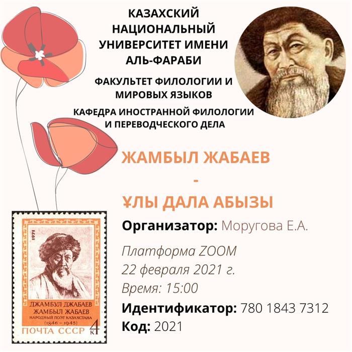 «Айналаңды нұрландыр» жобасы аясында филология және әлем тілдері факультетінің шетел филологиясы және аударма ісі кафедрасы «Шетел филологиясы» және «Журналистика» мамандықтарының 1 курс студенттерімен бірлесе отырып, сіздерді ауызша-поэтикалық өнердің ұлы шебері туғанына 175 жыл толуына орай «Жамбыл Жабаев – Ұлы дала абызы» атты әдеби кешке шақырады.