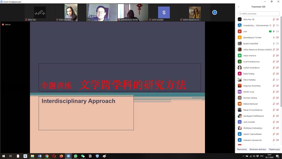 2020 жылдың қараша айының 5-26 аралығында Орталық Қытай аграрлық университеті әдебиет институтының профессоры