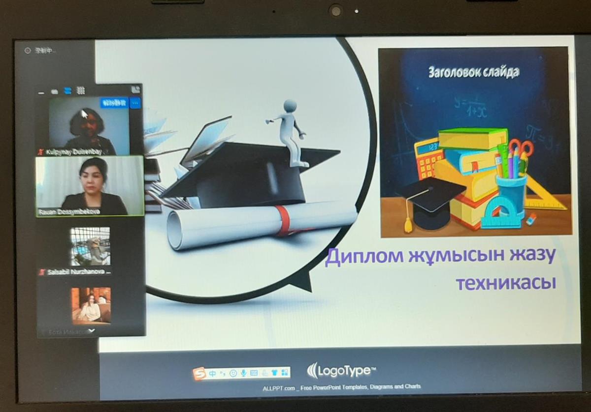 2020 жылдың 11 желтоқсанында Әл-Фараби атындағы Қазақ ұлттық университеті, шығыстану факультеті, қытайтану кафедрасының PhD докторы, доцент м.а. Досымбекова Рауан Өрікбайқызы 4-курс студенттері мен «Жібек жолы» үйірме мүшелеріне «Диплом жұмысын жазу техникасы» тақырыбы бойынша онлайн-дәріс өтті.
