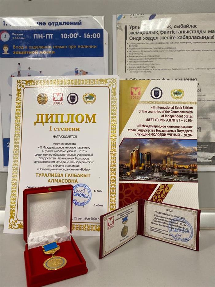 «Бөбек» Жалпы ұлттық қозғалысы заңды тұлғалардың қауымдастық нысанындағы бірлестігі ұйымдастырған Тәуелсіз Мемлекеттер достастығы елдерінің II ші Халықаралық кітап басылымында Биоалуантүрлілік және Биоресурстар кафедрасының 2 курс магистранты Туралиева Гулбакыттың “АТЫРАУ ОБЛЫСЫ АУМАҒЫНДА ӨСЕТІН RHEUM TATARICUM L ӨСІМДІГІНІҢ МОРФОЛОГИЯЛЫҚ ЖӘНЕ АНАТОМИЯЛЫҚ ҚҰРЫЛЫС ЕРЕКШЕЛІКТЕРІ” тақырыбында жұмысы жарияланып, “Үздік жас маман - 2020” атанды! Ғылыми жетекшісі Биоалуантүрлілік және Биоресурстар кафедрасының доценті, аға оқытушысы Ахтаева Нурсулу Зияхановна алғыс хатпен марапатталды!
