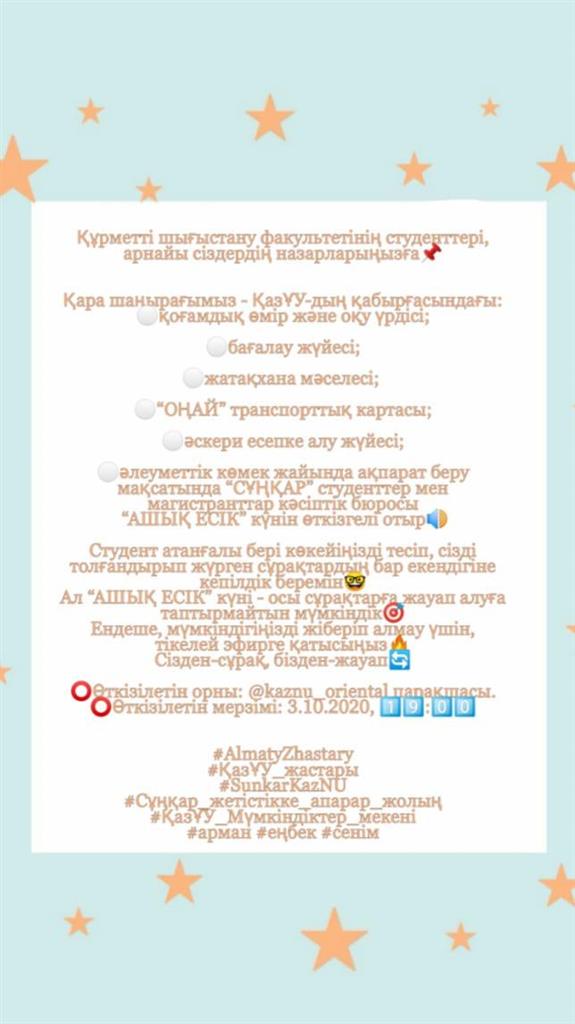 Шығыстану факультетінің студенттеріне арнап «АШЫҚ ЕСІК» куні өткізілді. Онда студенттердің қоғамдық өмір, оқу үрдісі жатақхана мәселесі, әскери есепке алу жүйесі, әлеуметтік көмек, «ОҢАЙ» транспорттық картасы жайында сауалдарына жауап берілді.