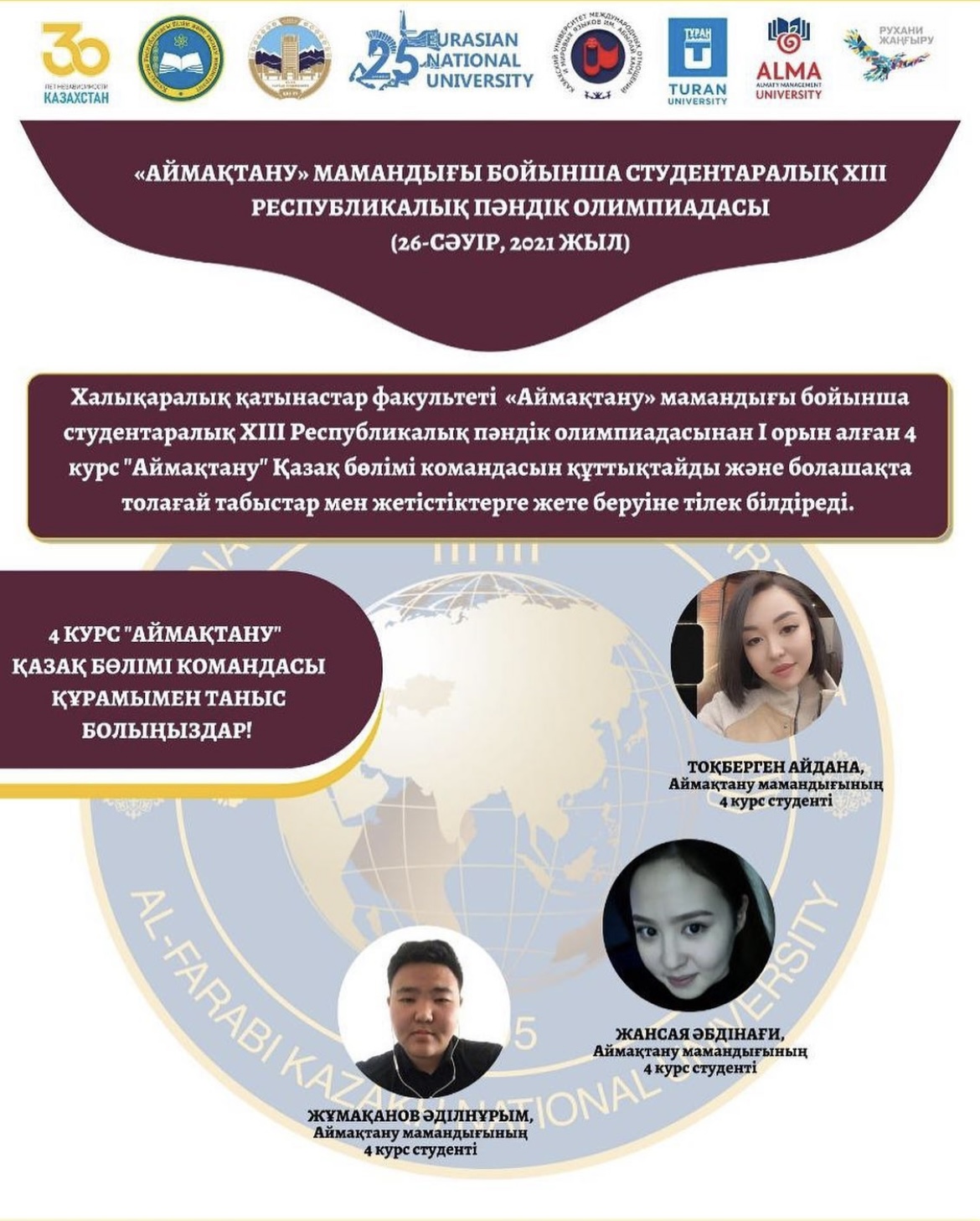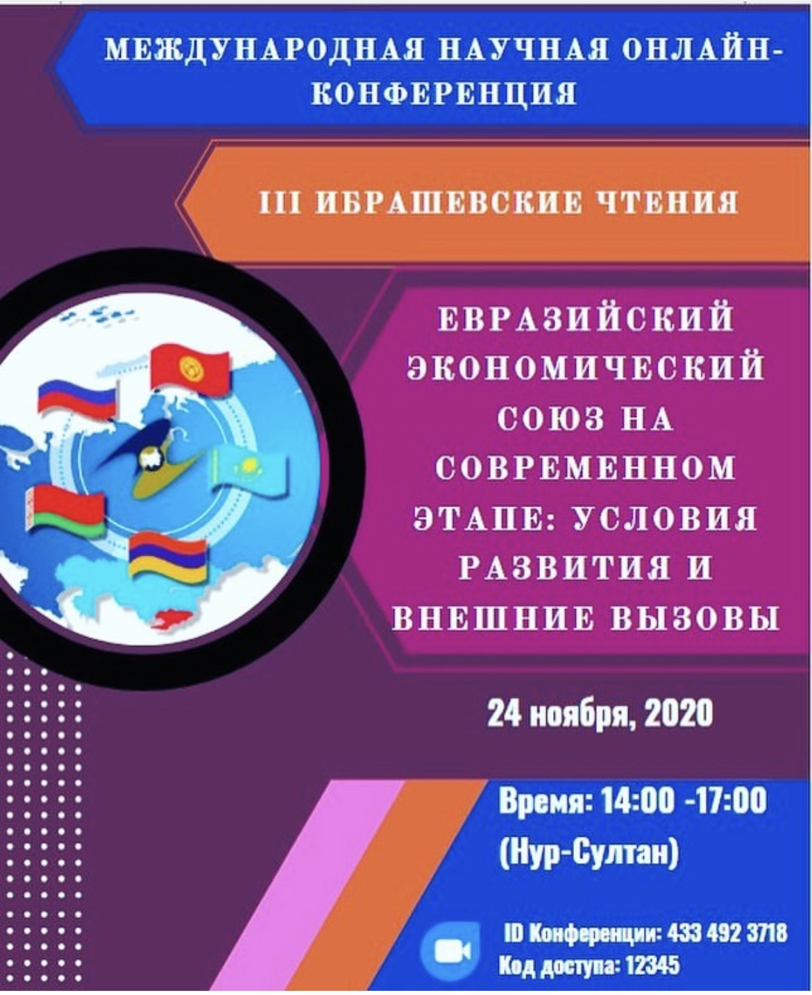 Құрметті әріптестер, оқытушылар, докторанттар, магистранттар, студенттер! Әл-Фараби атындағы ҚазҰУ-дың Еуразиялық зерттеулер орталығы, Әл-Фараби атындағы ҚазҰУ-дың халықаралық қатынастар факультеті, Еуразия-Поволжье ақпараттық-талдау орталығы сізді Халықаралық ғылыми конференцияға (онлайн) қатысуға шақырады: III Ибрашев оқулары "Қазіргі кезеңдегі Еуразиялық Экономикалық Одақ: даму шарттары және сыртқы сын-тегеуріндер", 2020 жылы 24 қарашада сағат 14.00-де Әл - Фараби атындағы ҚазҰУ халықаралық қатынастар факультетінің 25 жылдығына арналған іс-шаралар аясында өтеді.