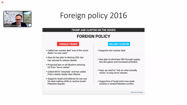Дәріске 50-ден астам студенттер, магистранттар және докторанттар қатысты. Бірінші бөлімде профессор АҚШ-тағы 2020 жылғы сайлауға қатысты негізгі мәселелерге тоқталды: демократтар мен республикашылдардың қарама-қайшылықтары, АҚШ сайлау жүйесінің кемшіліктері, бұрмалаушылық және Америкадағы сайлаудың әлемдік саясат үшін маңызы.