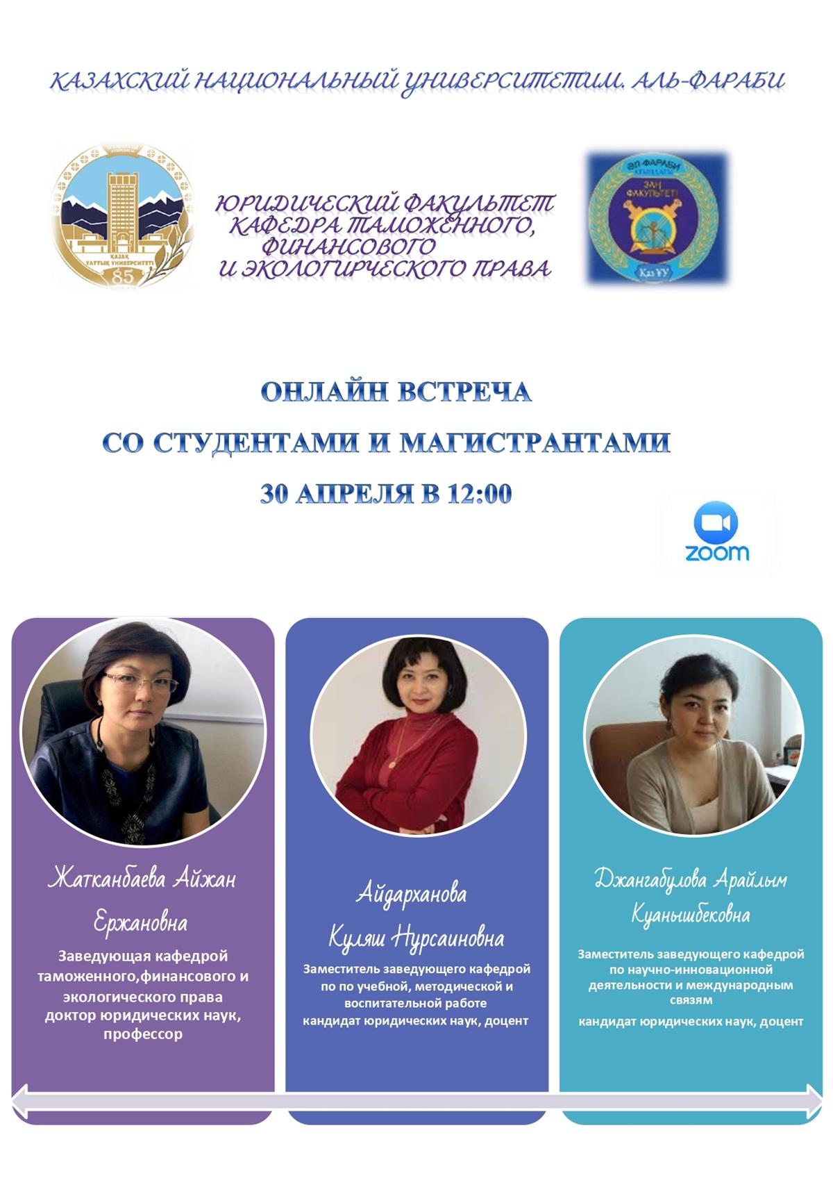 24.09.2020Кедендік, қаржылық және экологиялық құқық кафедрасының профессорлық-оқытушылық құрамы кафедраны онлайн режимінде өткізді.