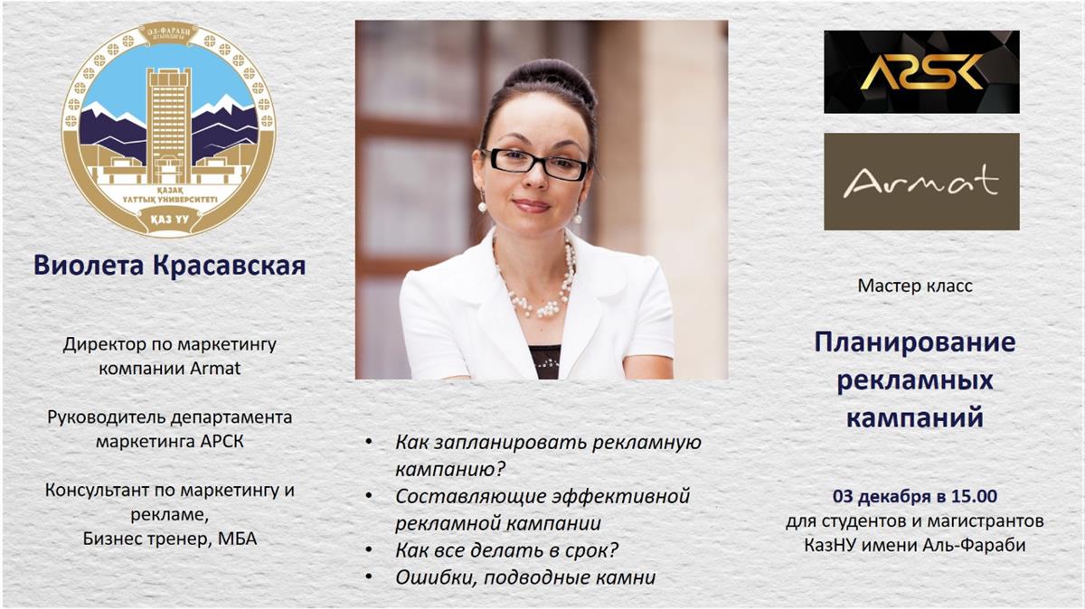 2021 жылдың 3 желтоқсанында маркетинг бойынша талдаушы, бизнес-тренер, маркетинг және жарнама бойынша кеңесші, MBA, Қазақстанжарнама мамандары қауымдастығының маркетинг жөніндегі директоры және «Армат» зергерліккомпаниясының маркетинг жөніндегі директоры Виолета Красавская әл-Фараби атындағы ҚазҰУ«Бизнес-технологиялар» кафедрасының«Маркетинг» мамандығының студенттері мен магистранттарына арналған «Жарнамакампаниясын жоспарлау» тақырыбында мастер-класс сабағын өткізді.