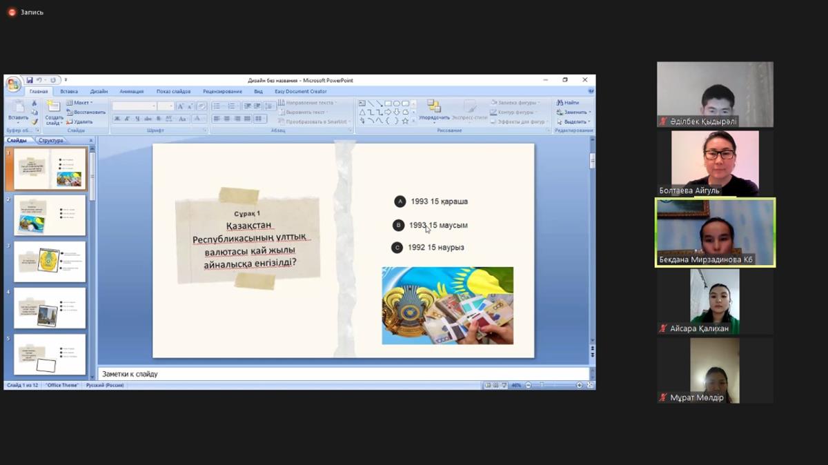 08.12.2021 ж. 14.00 сағ. әл-Фараби атындағы Қазақ Ұлттық университеті ЭжБЖМ «Бизнес-технологиялар кафедрасы» Логистика мамандығының 4 курс Л18к1 және Л18к5 топтарыстуденттерінің ұйымдастырылуымен «Тәуелсіздік - тұмарым, Мәңгілік ел - тұрағым!» тақырыбына факультеттік деңгейде тәрбиелік іс-шара өткізілді. Куратор-эдвайзер: Баймуханбетова Э.Е.