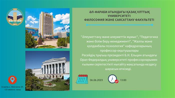 Әл-Фараби атындағы ҚазҰУ Философия және саясаттану факультеті академиялық серіктестіктігін ілгерілету мақсатында 2023 жылдың 6 маусым күні факультеттің профессор-оқытушылары Ресейдің тұнғыш президенті Б.Н. Ельцин атындағы Орал Федералдық университеті профессорларымен кездесу шарасын өткізеді.