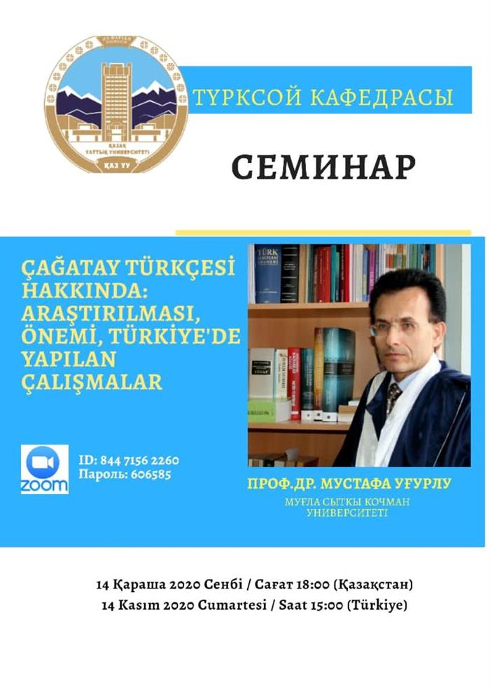 Сіздерді «Жазба ескерткіштері және рухани мұра» ғылыми-зерттеу орталығымыз ұйымдастырған осы сенбі, 2020 жылғы 14 қараша, сағат 18.00-де (Нұр-Сұлтан уақыты бойынша) өтетін «Шағатай тілі нің Түркиядағы зерттеулер» атты тақырыбындағы ғылыми семинарға шақырамыз. ). Спикер - арнайы шақырылған ғалым, Мугла Сыткы Кочман университетінің (Түркия) профессоры, доктор Мұстафа Угурлу.