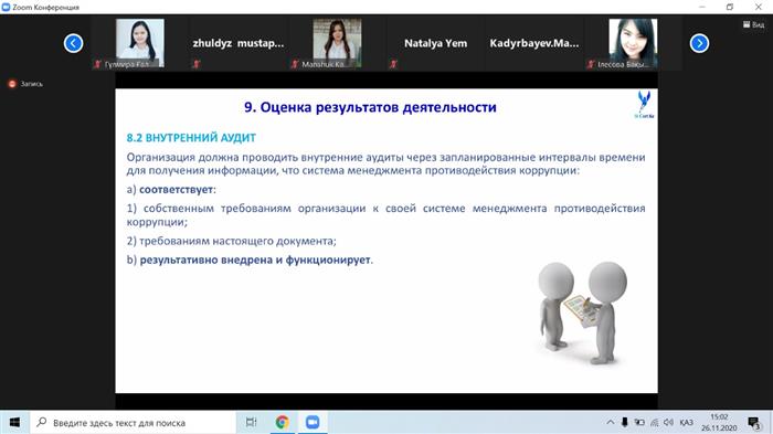 26.11.202024-26 қараша аралығында Әлеуметтік-тәрбие жұмыс жөніндегі басқарма басшысы Абишев Т.Б. ұйымдастыруымен өткен «Халықаралық стандартқа сәйкес сыбайлас жемқорлыққа қарсы менеджмент жүйесі ISO 37001 2016» тақырыбындағы онлайн семинарға «Менеджмент» кафедрасының оқытушысы Ғалымқызы Гүлмира қатысты.