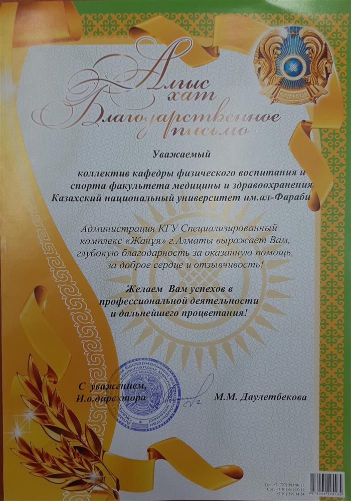 21 желтоқсанда дене шынықтыру және спорт кафедрасының ұжымы Алматы қаласындағы «Жанұя» КММ балалар үйінің тәрбиеленушілеріне кеңсе тауарларын сатып алу арқылы қайырымдылық шарасын ұйымдастырды. Елдегі карантиндік шараларға байланысты балалармен жүздесуге мүмкіндік болмады. Бірақ, біз осы мекеменің директоры М.М. Даулетбековамен кездесіп және біздің кішкентай сыйлығымызды бердік. Әңгіме өте жылы жағдайда өтті. Кездесу барысында ол бізге балалар үйінің барлық жағдайын айтып берді және өзінің үлкен ризашылығын білдірді.