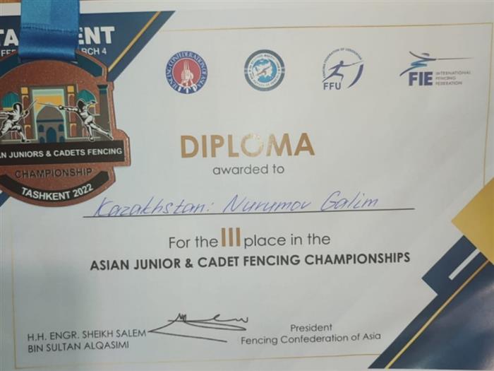 2022 жылдың 24 ақпаны мен 4 наурызы аралығында Ташкентте (Өзбекстан) семсерлесуден жасөспірімдер мен кадеттер арасында Азия чемпионаты өтті, оған Азияның ең үздік семсерлесушісі атағы үшін күрескен құрлықтың ең мықты спортшылары бас қосты. Бұл жарыстарда «Дене шынықтыру және спорт» мамандығы бойынша Медицина және денсаулық факультетінің 1 курс студенті Нурумов Ғалым 3 орынды жеңіп алды. Жылдың беделді жарыстарына 25-тен астам елдің өкілдері қатысты.