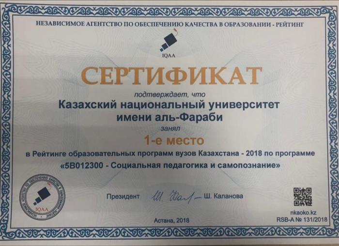 - Педагогика және білім беру менеджменті кафедрасы 2018 жылғы Қазақстан ЖОО оқу орындары рейтингісінде(IQAA) "6B012300 - Әлеуметтік педагогика және өзін-өзі тану (бакалавр)" білім беру бағдарламасы бойынша I орын алды.