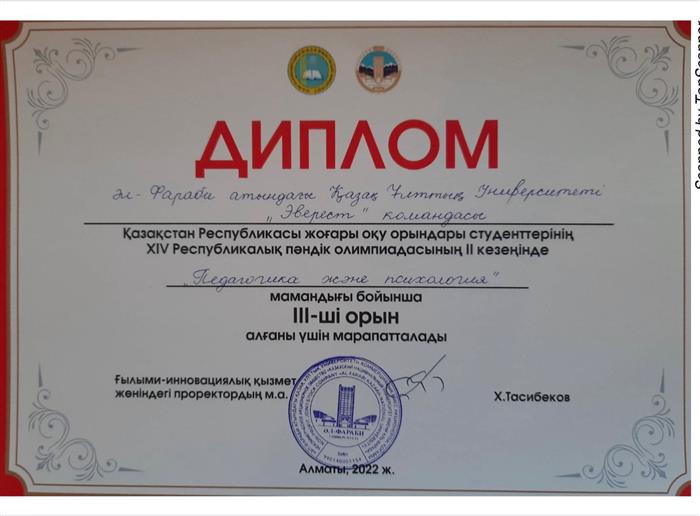 XV РЕСПУБЛИКАЛЫҚ ПӘНДІК ОЛИМПИАДАДА ӘЛ-ФАРАБИ атындағы ҚАЗҰУ-дың «ЭВЕРЕСТ» командасы 3-ШІ ОРЫНДЫ ИЕЛЕНДІ.КОМАНДА ҚҰРАМЫНДА «ПЕДАГОГИКА және ПСИХОЛОГИЯ» білім беру бағдарламасының студенттері: