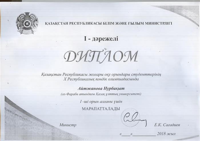 | Қазақстан Республикасы жоғары оқу орындары студенттерінің VIII Республикалық пәндік олимпиадасында Аблаева Райхан І-ші орын алғаны үшін марапатталды. |