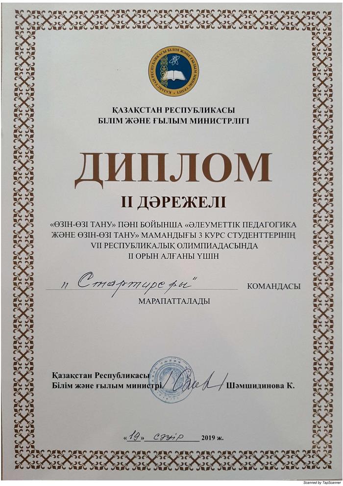 "Даналық жаршылары" командасы Қазақстан Республикасы жоғары оқу орындары студенттерінің XII Республикалық пәндік олимпиадасының 5B010300-Педагогика және психология мамандығы бойынша II-ші орын алғаны үшін марапатталды.