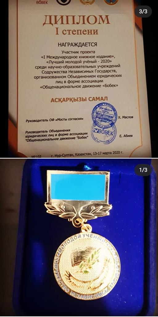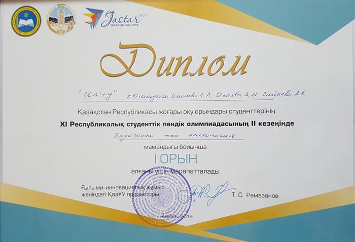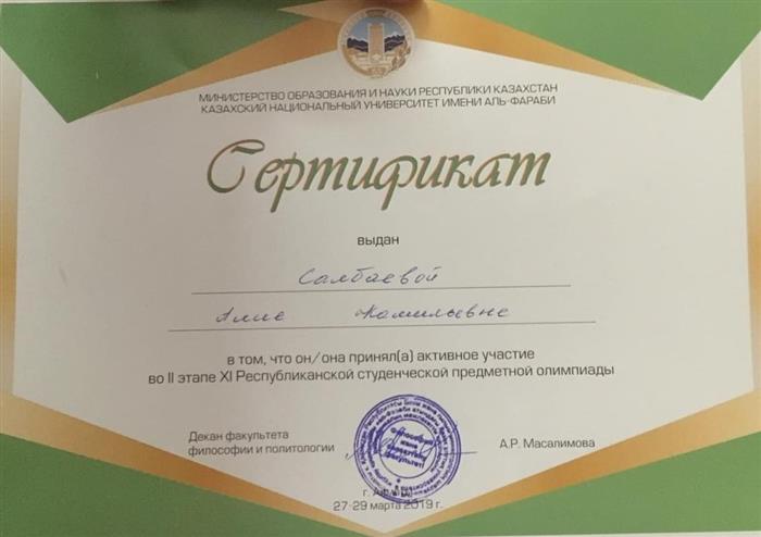 Салбаева Алия XI Республикалық студенттер арасындағы пәндік олимпиадаға белсенді қатысқаны үшін марапатталды. |