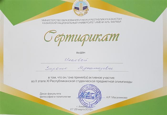 Исаева Зарема XI Республикалық студенттер арасындағы пәндік олимпиадаға белсенді қатысқаны үшін марапатталды. |