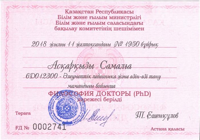 Қазақстан Республикасы Білім және ғылым министрлігі Білім және ғылым саласындағы бақылау комитетінің шешімімен Асқарқызы Самалға 6D012300- Әлеуметтік педагогика және өзін-өзі тану мамандығы бойынша философия докторы(PhD) дәрежесі берілді. |