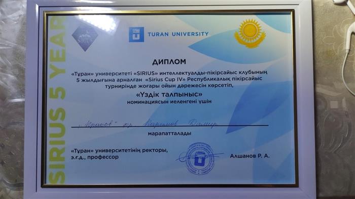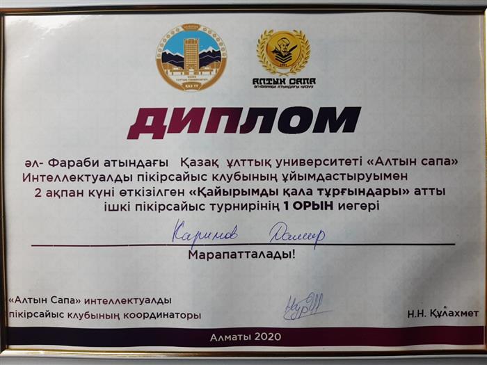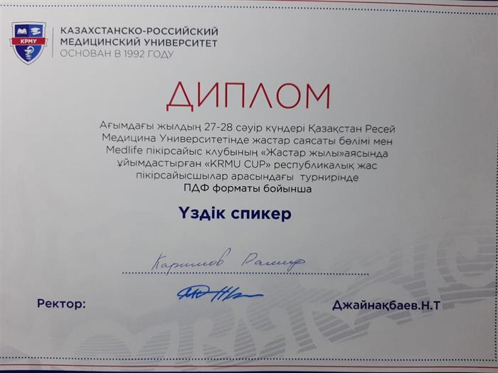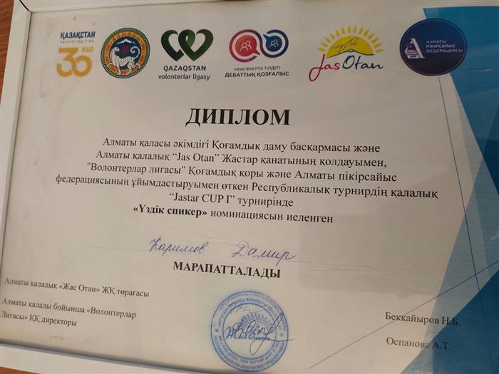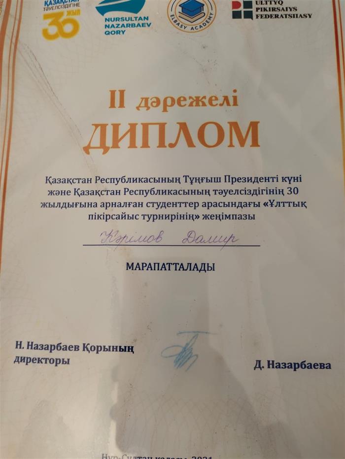 Диплом Үздік талпыныс Каримов Д. Республикалық пікірсайыс туры |