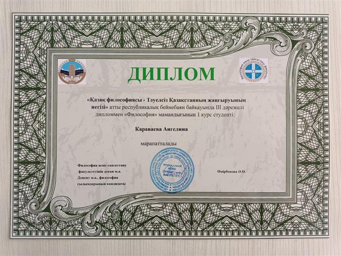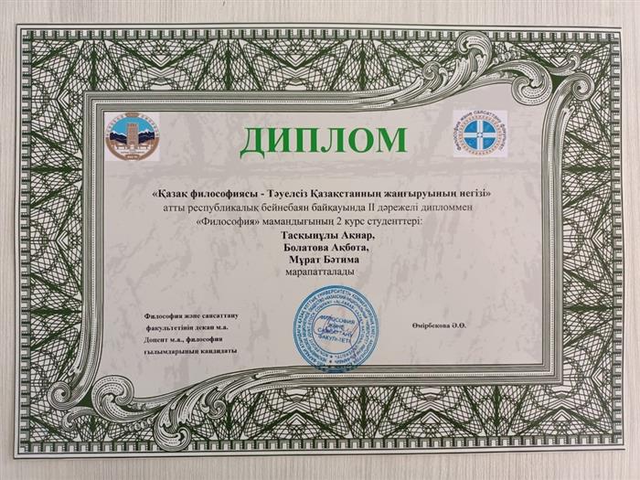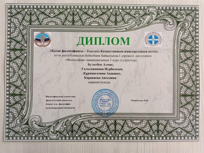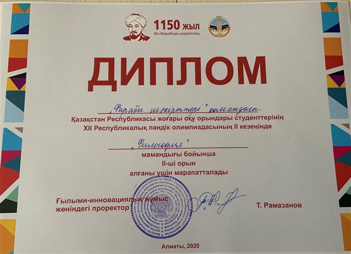 Қазақстан Республикасы жоғары оқу орындарының студенттерінің ХІІ Республикалық пәндік олимпиадасының ІІ кезеңінде "Философия" мамандығы бойынша "Фараби шәкірттері" командасы ІІ орын дипломымен марапатталды. Команда құрамы: Кәрімов Дамир, Қаниятов Жәнібек, Мукушева Асемгуль, Абдиканова Дарина. |