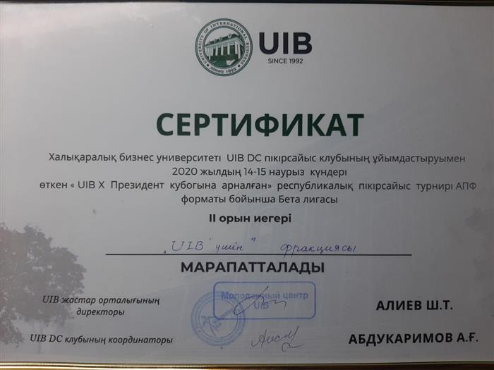 Республикалық пікірсайыс турында 2 орынға сертификат, командалық орын Каримов Д. UIB үшін |