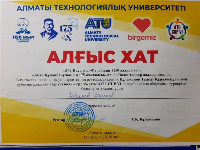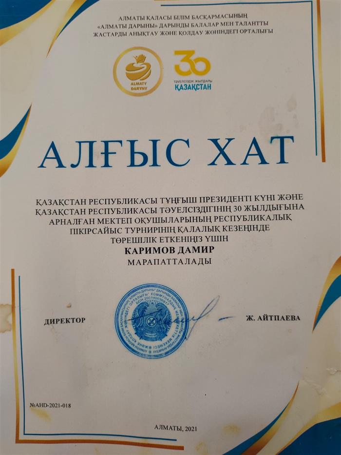 Республикалық пікірсайыс турниріне қатысқаны үшін алғыс хат Каримов Д. |