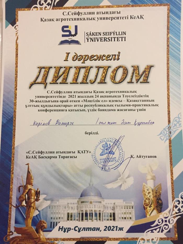 Республикалық ғылыми-практикалық конференцияда 1-дәрежелі диплом Каримов Д. |