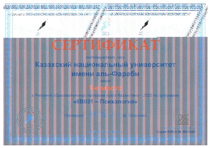 Әл-Фараби атындағы Қазақ ұлттық университеті 6В031-Психология бағдарламасы бойынша Қазақстан – 2020 ЖОО-ның білім беру бағдарламалары рейтингінде 1-орынды иеленді.