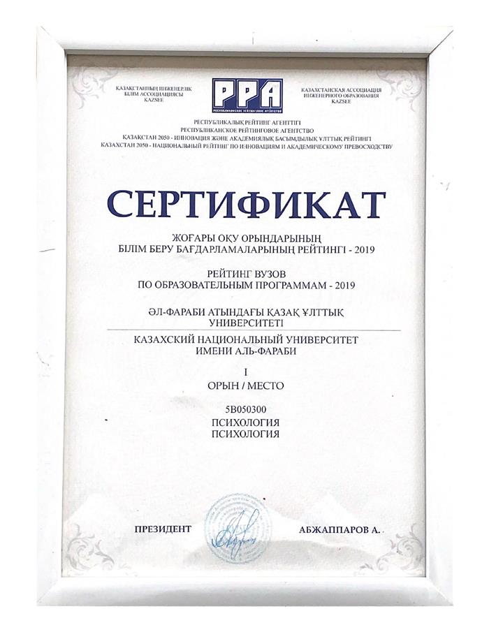 Жалпы және қолданбалы психология кафедрасы жоғары оқу орындарының білім беру бағдарламаларының рейтінгісі (РРА) бойынша "5B050300 - Психология (бакалавр)" білім беру бағдарламасынан I орын алды.