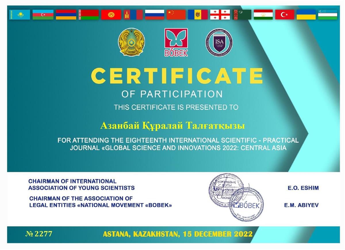 Азанбай Қ. Т. "Жаһандық ғылым және инновациялар" журналына мақала беріп, қатысу сертификатын алды