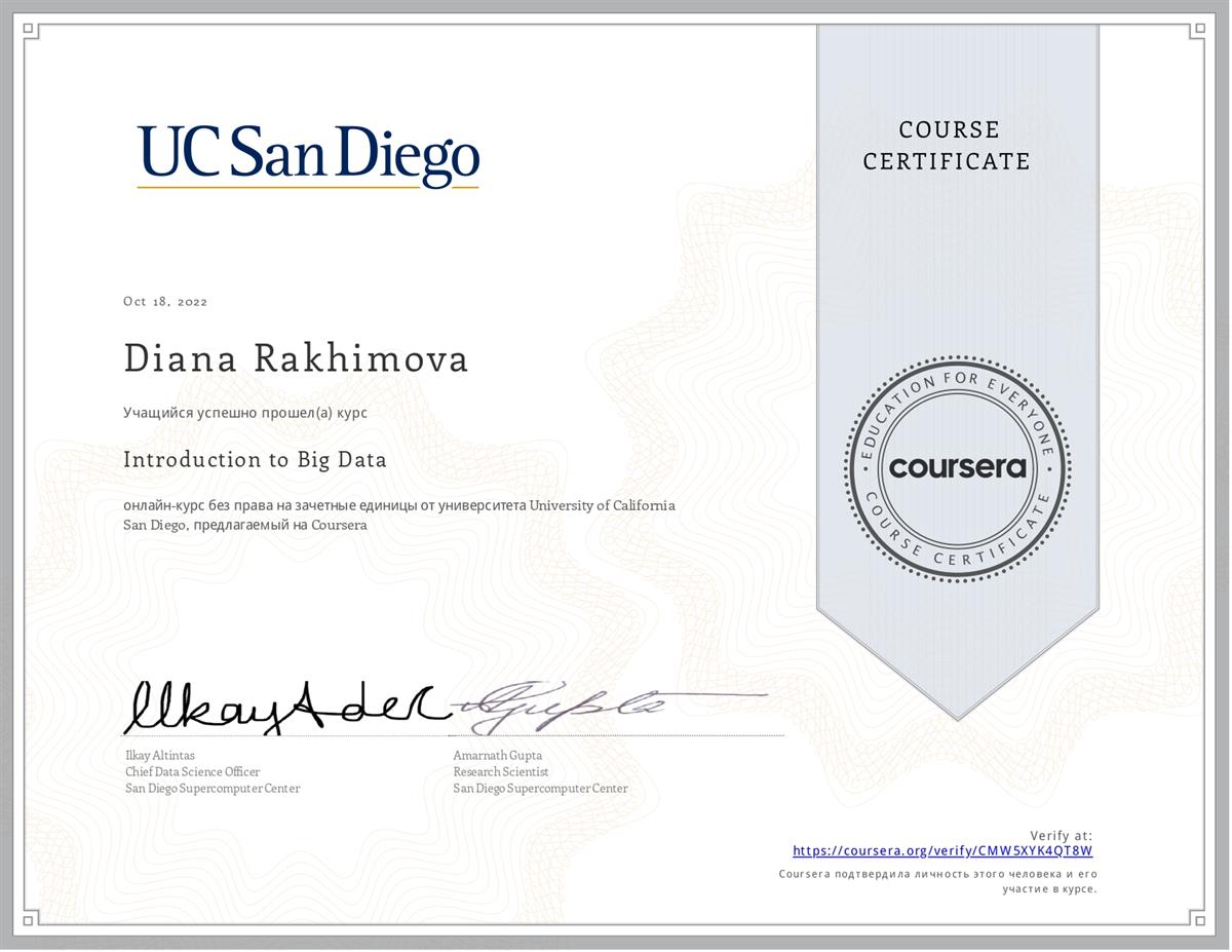 Бұл сертификат Рахимова Д.Р. Coursera платформасындағы "Introduction to Big data" курсын сәтті аяқтағанын көрсетеді