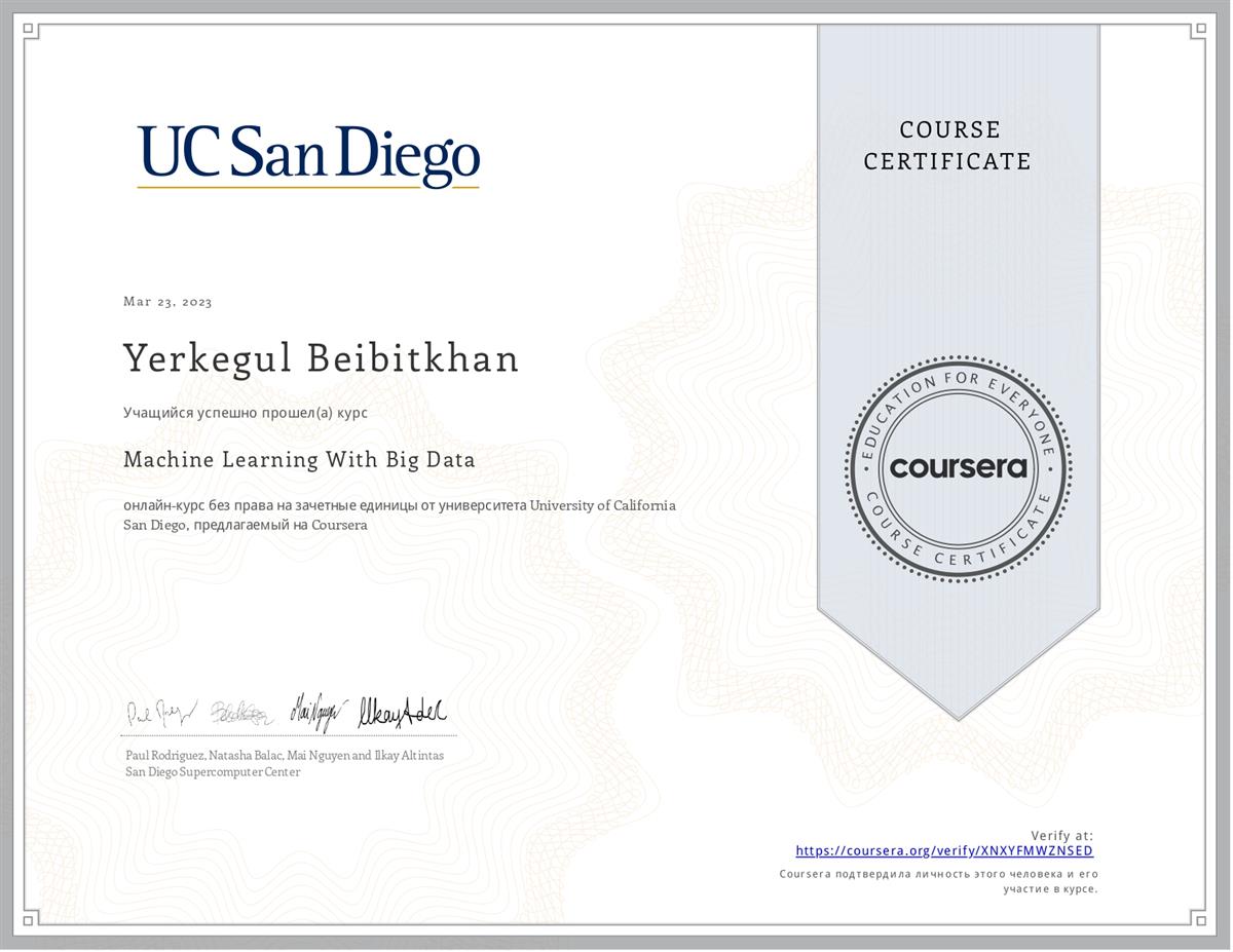 Бұл сертификат Бейбітхан Е. Coursera платформасындағы "Machine Learning with Big data" курсын сәтті аяқтағанын көрсетеді
