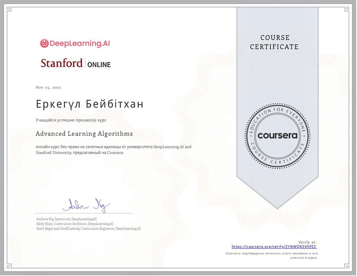 Бұл сертификат Бейбітхан Е. Coursera платформасындағы "Advanced Learning Algorithms" курсын сәтті аяқтағанын көрсетеді