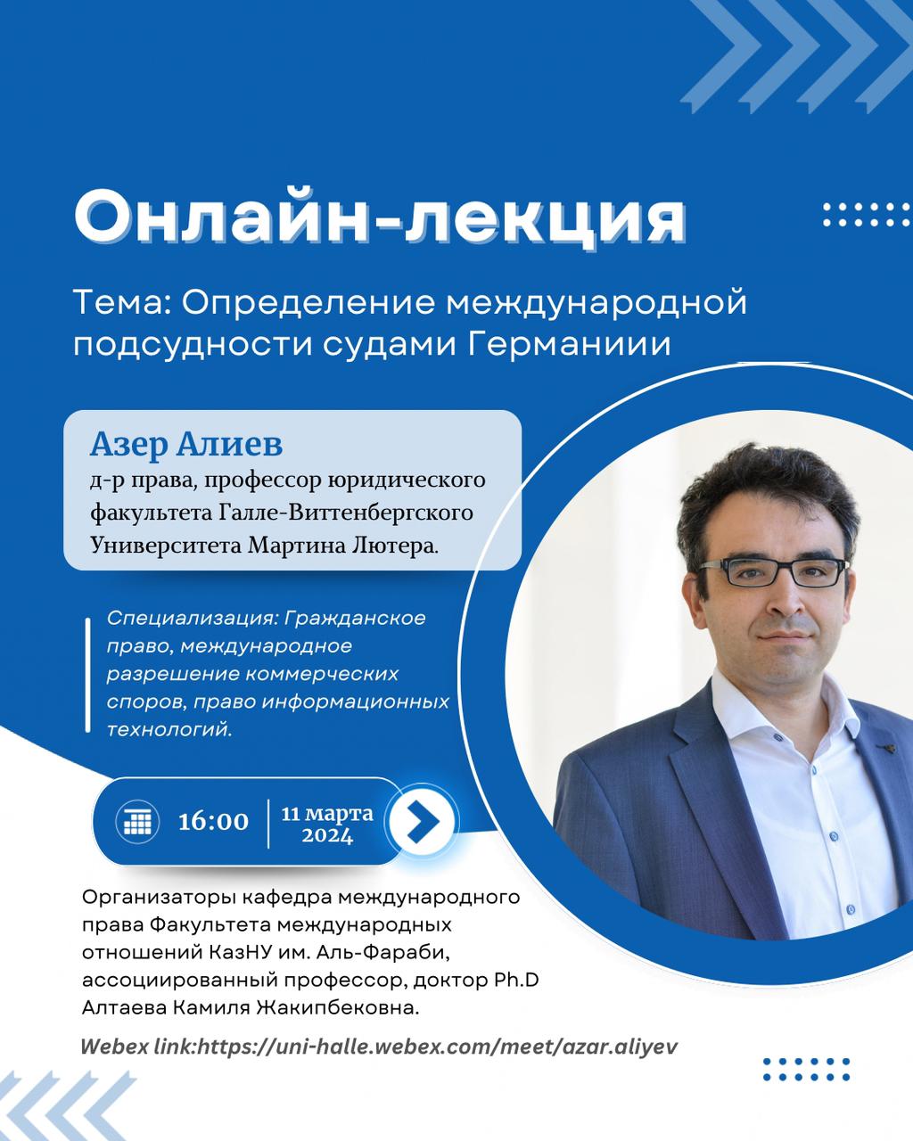11.03.20242024 жылдың 11 наурызында заң ғылымының докторы, Мартин Лютер атындағы Галле-Виттенберг Университетіндегі заң факультетінің профессоры Азер Алиевпен «Германия соттарымен халықаралық соттылықтың анықталуы» тақырыбында ТДМ 4 аясында онлайн дәріс өтті.